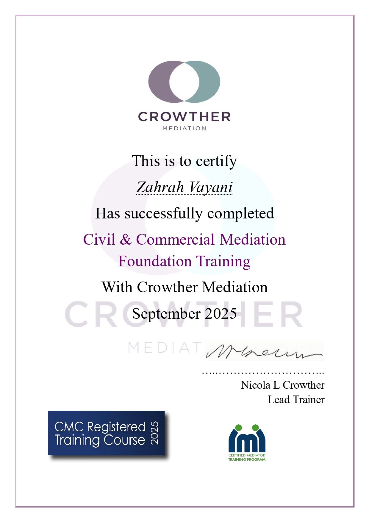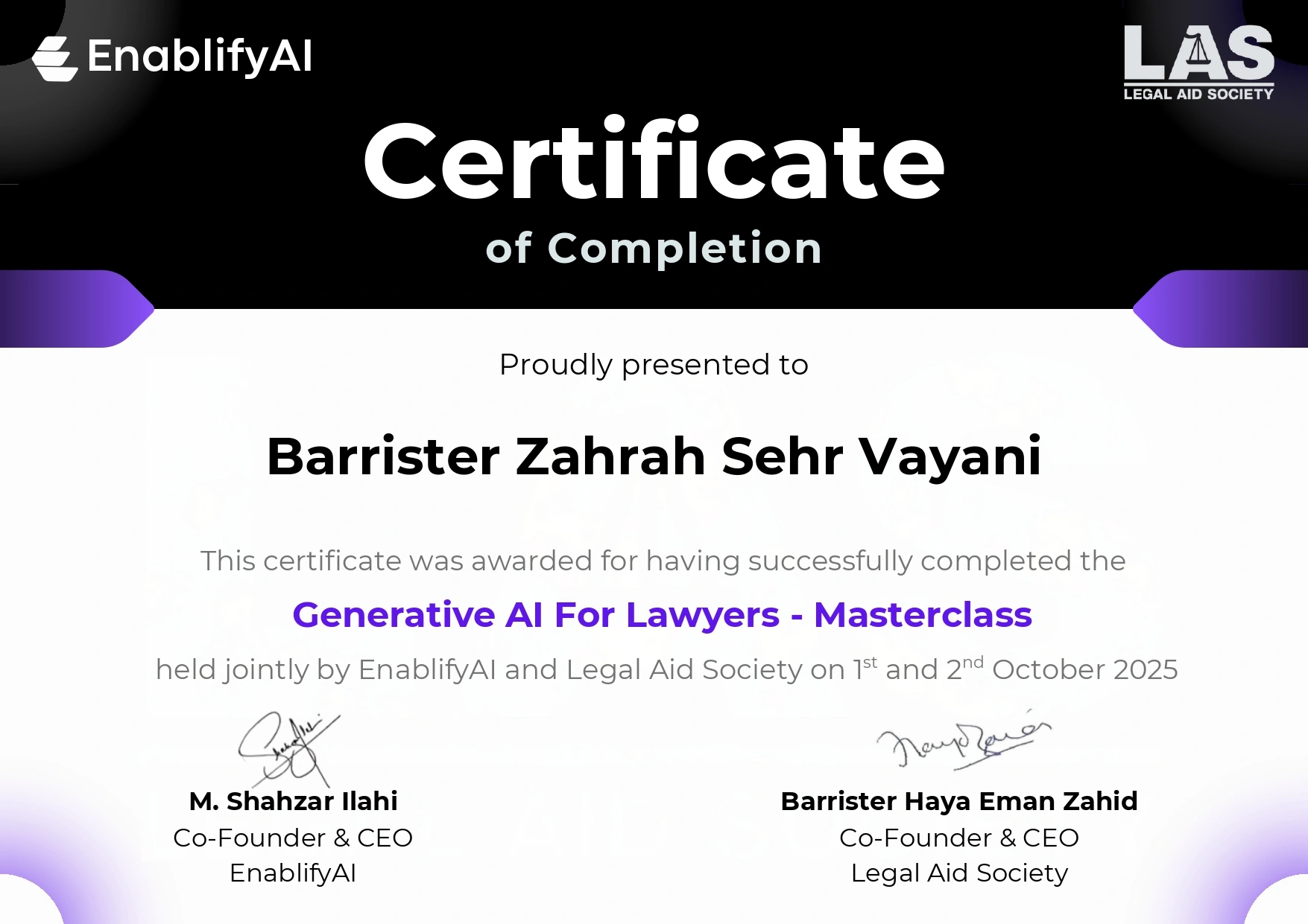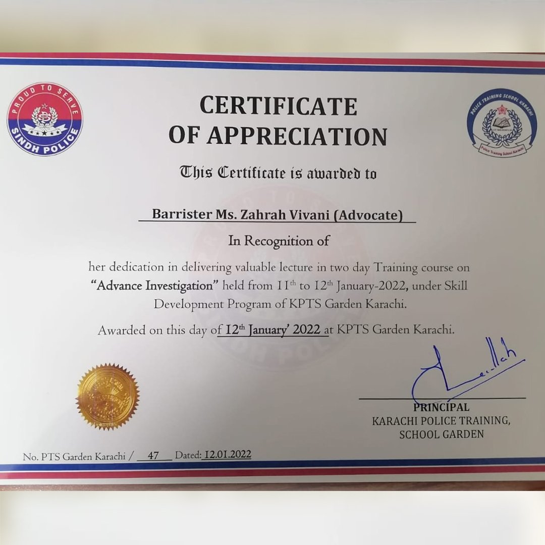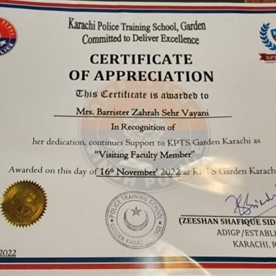 She has founded her own law firm Zahrah S. Vayani & Associates. She has been appointed as The Assistant Attorney General of Pakistan. Miss Vayani serves as the C.E.O of the Women Lawyers Association and has been a strong advocate for the advancement and empowerment of women in the legal profession and otherwise. She is also the Subject matter and technical expert on the Provincial Parliamentary Advisory Committee for Child Abuse.